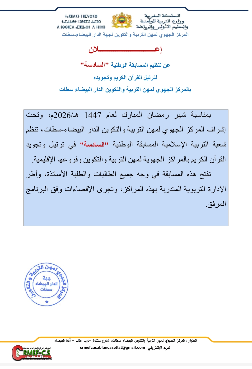 إعلان عن تنظيم المسابقة الوطنية “السادسة” لترتيل القرآن الكريم وتجويده إعلان عن تنظيم المسابقة الوطنية “السادسة” لترتيل القرآن الكريم وتجويده بالمركز الجهوي لمهن التربية والتكوين الدار البيضاء سطات